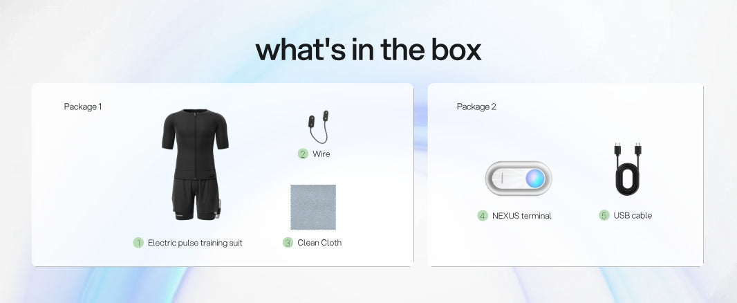 Train your full body anytime, anywhere — strengthen core, tone muscles, and boost recovery in just 20 minutes. The set includes a smart EMS top and shorts plus the Nexus controller, all Bluetooth-controlled via the Sweetmyo App.
